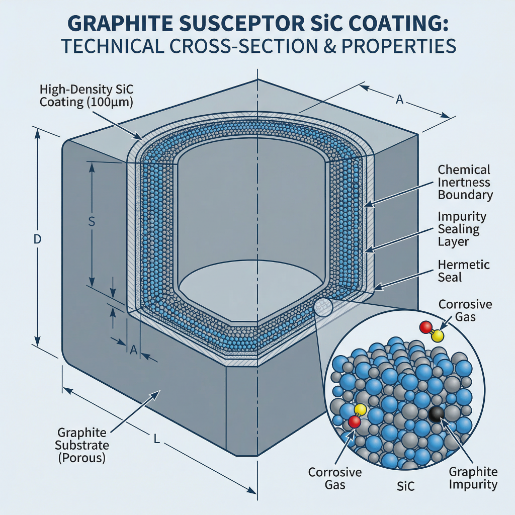 MOCVD یا epitaxial عملوں میں، graphite susceptors کو عام طور پر اعلی کارکردگی والی کوٹنگز کی ضرورت ہوتی ہے۔ مثال کے طور پر، سلیکون کاربائیڈ (SiC) کوٹنگ کی کثافت براہ راست اس کی سبسٹریٹ کے اندر موجود نجاستوں کو سیل کرنے کی صلاحیت کا تعین کرتی ہے۔