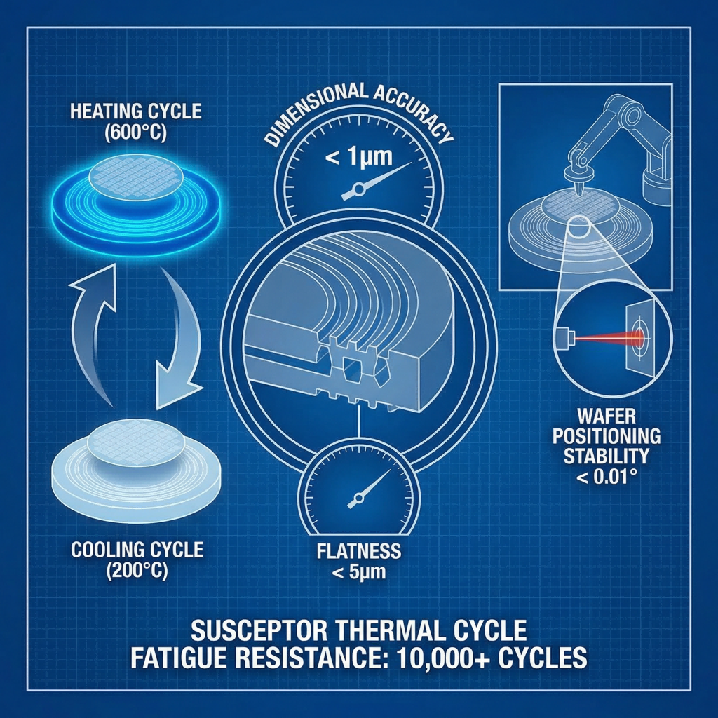 پریمیم سسپٹرز کو تھرمل سائیکل تھکاوٹ کے خلاف بہترین مزاحمت کا مالک ہونا چاہیے۔ حرارتی اور کولنگ کے طویل چکروں کے دوران، سسپٹر کو جہتی درستگی اور ہمواری کو برقرار رکھنا چاہیے تاکہ مکینیکل ڈائیسٹورشن کی وجہ سے ویفر پوزیشننگ انحراف کو روکا جا سکے، اس طرح اس بات کو یقینی بنایا جائے کہ ہر بیچ کی پیداوار متوقع بنیاد پر رہے۔ حرارتی اور ٹھنڈک کے طویل چکروں کے دوران، سسپٹر کو جہتی درستگی اور ہمواری کو برقرار رکھنا چاہیے تاکہ مکینیکل بگاڑ کی وجہ سے ویفر پوزیشننگ انحراف کو روکا جا سکے، اس طرح یہ یقینی بنایا جائے کہ ہر بیچ کی پیداوار متوقع بنیاد پر رہے۔