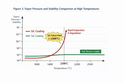 بے مثال تھرموڈینامک استحکام: ٹینٹلم کاربائیڈ (TaC) 3880 ° C کے حیرت انگیز پگھلنے والے مقام پر فخر کرتا ہے۔ جرنل آف کرسٹل گروتھ میں ہونے والی تحقیق کے مطابق، SiC کوٹنگز 2200 ° C سے اوپر "غیر متضاد بخارات" سے گزرتی ہیں — جہاں سیلیکون کاربن سے زیادہ تیزی سے سبلیمیٹ ہوتا ہے، جس سے ساختی انحطاط اور ذرات کی آلودگی ہوتی ہے۔ اس کے برعکس، TaC کا بخارات کا دباؤ 3 سے 4 ہے۔کرسٹل نمو کے لیے ایک قدیم تھرمل فیلڈ کو برقرار رکھتے ہوئے، SiC سے کم شدت کے آرڈرز۔